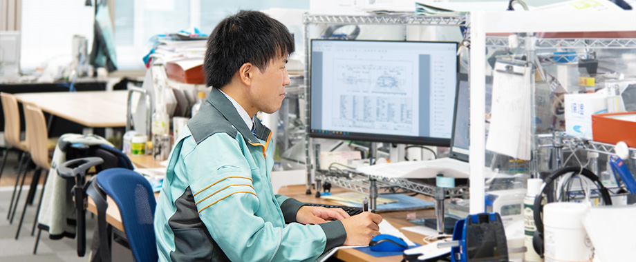 受注業務を行う上期は本社に出社し、午前中はメールの確認と返信、午後は補修工事の見積もりを確認したり、図面を見て必要な機器の見積もりを協力業者に依頼したり、基本的にデスクワークです。たまにですが、機械のトラブルなどがあったときはメーカーの方と一緒に現場へ行って対応に当たることもあります。
