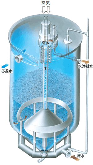 - ろ過して汚濁物を捕捉したろ材(4)は、(5)から吹き込まれた空気によりエアリフト管(6)に導かれ上昇します。