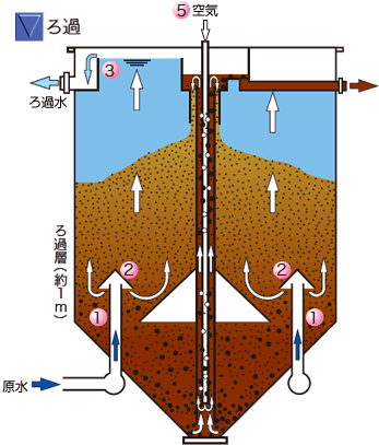 - 原水はろ過層を上昇し、SS等が取り除かれ、清澄ろ過水となって(3)からオーバーフローします。