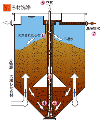 - 剥離したSSは(7)から排出され、洗浄されたろ材は(8)からろ過層に戻ります。