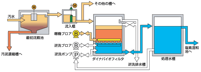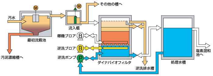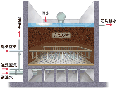 固定床式のため定期的な逆洗が必要です。比較的低濃度の排水を高度に処理する場合に最適です。 下水、製紙排水処理、各種産業排水処理に適応しています。