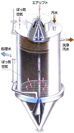 移動床式生物膜濾過装置です。生物処理層と沈殿池を一体化させたもので、生物処理と濾過を同時に行い、高負荷にも対応できコンパクトです。生物処理層には特殊担体が充填してあり、ばっ気風量も非常に少なくできています。