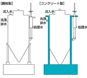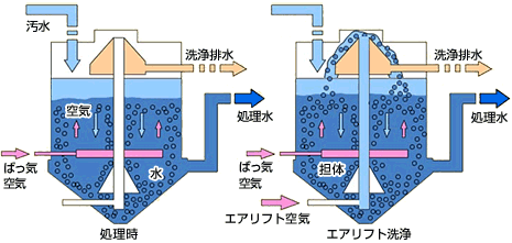 固定式の場合は生物膜を定期的に洗浄する必要があり逆洗が必要ですがダイナバイオトロンは不要です。生物処理により発生した汚泥を連続または断続的に処理を停止しないで排出できます。比較的小規模な有機性排水処理には最適です。小規模下水、有機性産業排水処理に適応しています。