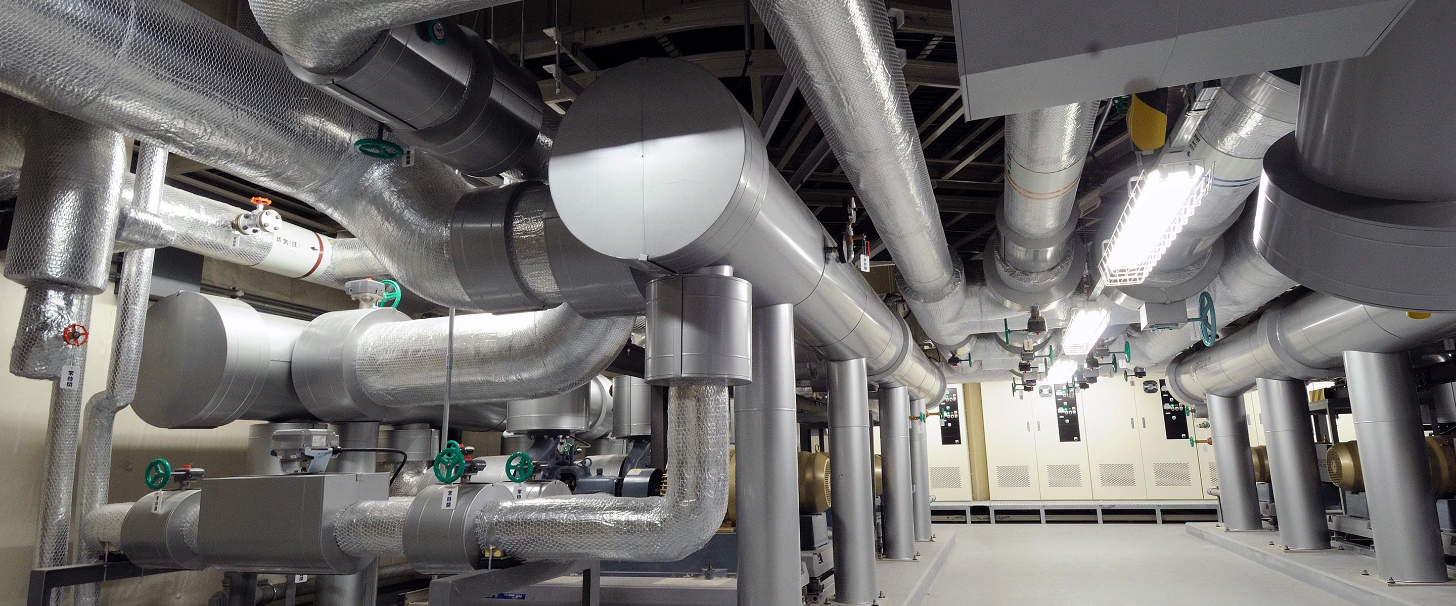地域冷暖房は、一ヶ所の熱源プラントから複数の建物群に地域配管を通して、冷水や温水、蒸気等を送り、冷暖房・給湯を行う都市基盤施設であり、エネルギー利用の効率化を図るため、高密度化し、高効率機器やシステムの採用、未利用エネルギーの活用を通して省エネルギー化に寄与した施設です。また、最近では災害拠点施設の観点から発電もおこない、その排熱で冷暖房をおこなうなど、ますますその重要度が増してきています。
