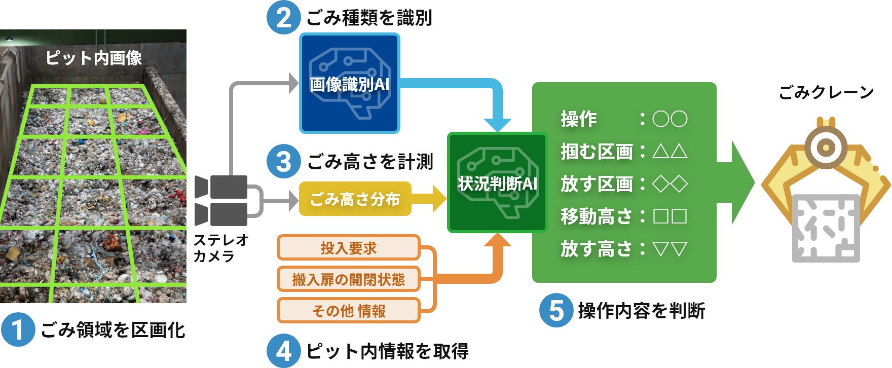 この度開発したAIごみクレーンシステムは、まずステレオカメラによりごみが貯留されたピット内の画像を区画化し、ごみの種類と高さをそれぞれ画像識別AIと状況判断AIによりリアルタイムに認識。ごみの投入要求や搬入扉の開閉状態を情報として与え、クレーンをどのように操作するか判断・指示します。画像識別AIについては国立研究開発法人産業技術総合研究所と共同開発しました。