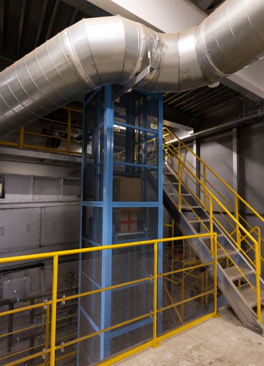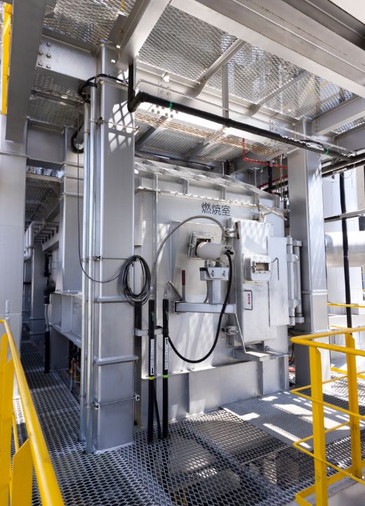 医療系廃棄物も取り扱う同施設では、焼却炉への供給ルートを通常の産業廃棄物と分けるために、専用の搬送コンベアを設置し、密封状態で医療系廃棄物を供給します。焼却炉には、当社独自の水冷式ストーカ(火格子)を導入し、高カロリーごみに対して耐久性の高い設備を構築しています。また、焼却炉から出た排ガスは、再燃焼室で有害物質の濃度を低減し、冷却・薬品処理を経て、バグフィルタ(ろ過式集塵機)でダイオキシン類を分解除去。クリーンなガスとして排出しつつ、一部を焼却炉に戻して窒素酸化物の発生を抑制する排ガス再循環システムを採用しています。さらに親会社である三機工業㈱R&Dセンターとの連携により、AI技術を活用した画像認識機能と状況判断機能で、ごみクレーンの操作を自動化する「AIごみクレーンシステム」を導入し、運営管理の省力化を図りました。