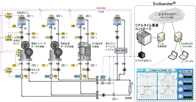三機工業株式会社(代表取締役社長:長谷川 勉)は、電気やガスなどを動力源とする空調設備の熱源システムにおいて、各機器の制御目標値をリアルタイムで同時に算出し、消費エネルギー合計値を常時最小にする熱源リアルタイム最適化システム「EcoSearcher®」を開発しました。これにより最適化しない場合と比較して約30%、従来の最適化方式と比較して約10%の省エネルギー率向上が可能となります。(当社試算)
