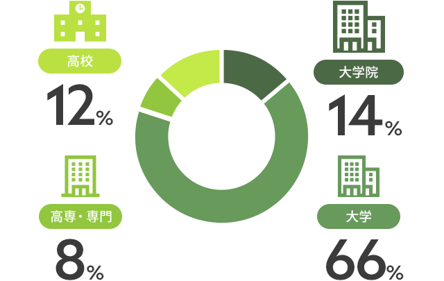 従業員の学歴区分としては大学卒が一番多いという結果になっていますが、採用において学歴による制限はありません。