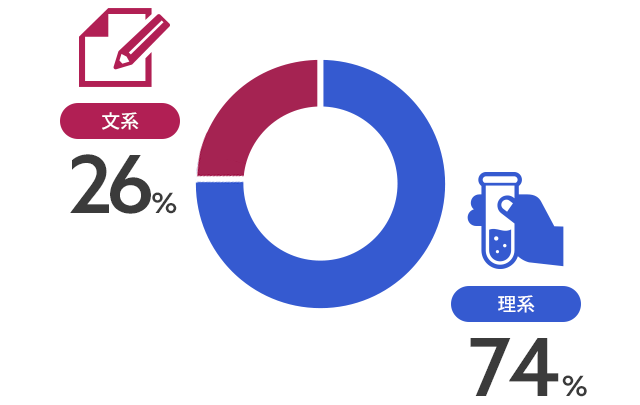 設計・施工管理・研究職は理系出身者が多く、管理支援職(経理・人事・法務等)は文系出身者が多いです。また、文・理とも出身学部・学科はバラエティに富んでおり、多様な人財が活躍しています。