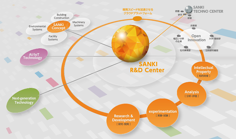 オープンイノベーションというスタイルを更に一歩進め、新しい研究開発の形を創るために、SANKI R&Dセンターは誕生しました。私たちはこれまで、「総合エンジニアリング企業」として空気、水、熱、電気、そして情報といった、都市・建物・生産のインフラを支える多彩な要素技術を高めてきました。そこに、AI/IoTの他、様々な先進テクノロジーを組み合わせることで、これまでにない付加価値や技術・製品をいち早く生み出すことを目指します。