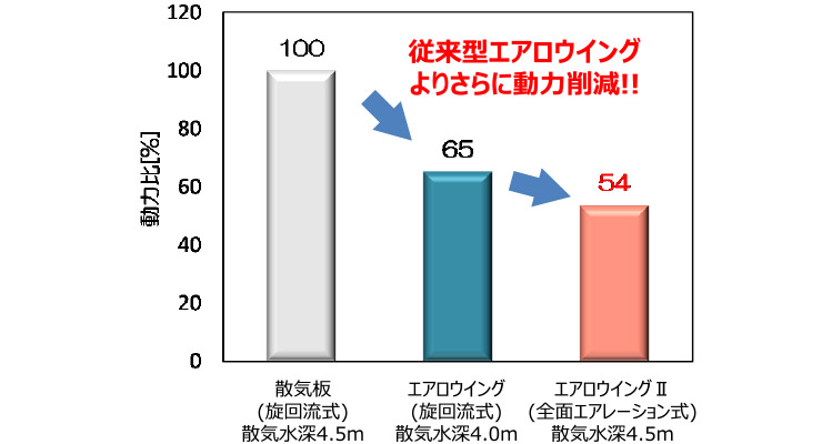 発泡メカニズムの解明により、高効率を維持しながら、低圧力損失を実現。 → 曝気動カ CO2 削減