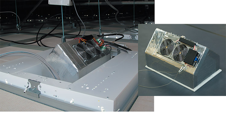 FDUを照明器具や設備プレートに載せて、通信子機がつながった電源配線を接続するだけで、天井内工事が完了します。また、通信子機はコンセント接続としているため、室内のレイアウトに合わせたFDUの移設·増設が容易に行えます。