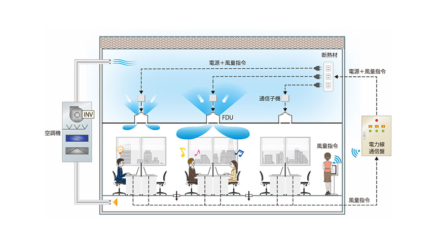 天井内に空調空気を直接供給し、天井面の約10m毎に設置した軽量小型のファン付吹出口(以下 FDU※)を用いて室内の必要な場所に必要なだけ送風するダクトレス空調方式です。FDUの風量設定はPCやタブレット端末などを用いて、在室者が1台単位で自由に操作できます。FDUの風量制御は電力線通信を用いているため、専用の制御配線は不要です。また、FDUに給気ダクトを接続する必要がなく、かつ、シンプルな電力配線のみで構成されているため、ダクト工事量の削減だけでなく、運用後のレイアウト変更にも簡単に対応できます。※FDU(Fan Diftuser Unit)の間