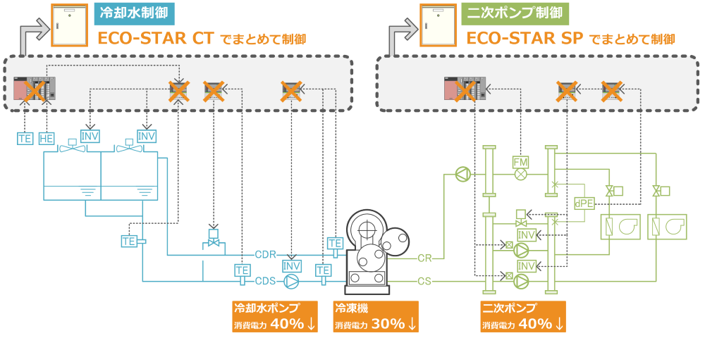 熱源設備のCOP(成績係数)改善と熱搬送用ポンプ類の効率的な運転制御により、熱の生成および搬送に関わる消費電力を削減する省エネコントローラです。