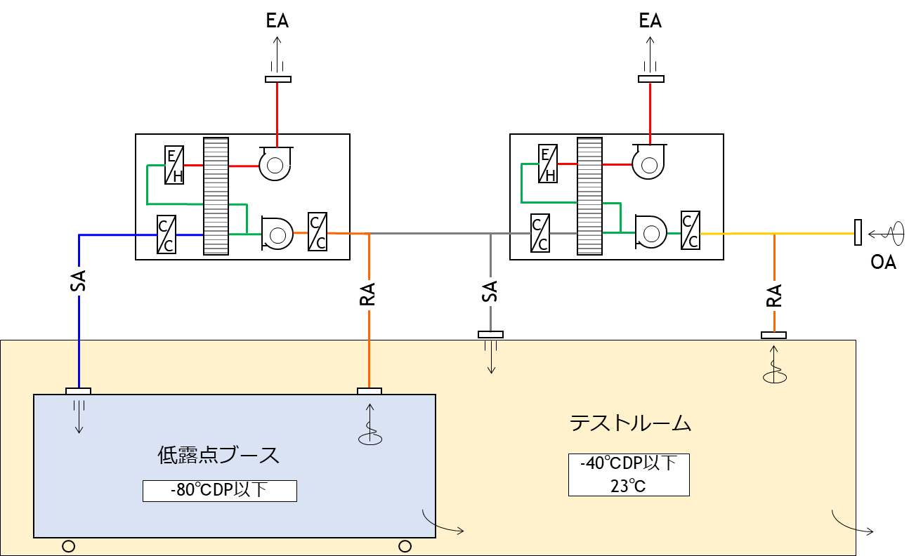 - 低露点ブース用除湿機の排気をテストルーム用除湿機に再利用します。