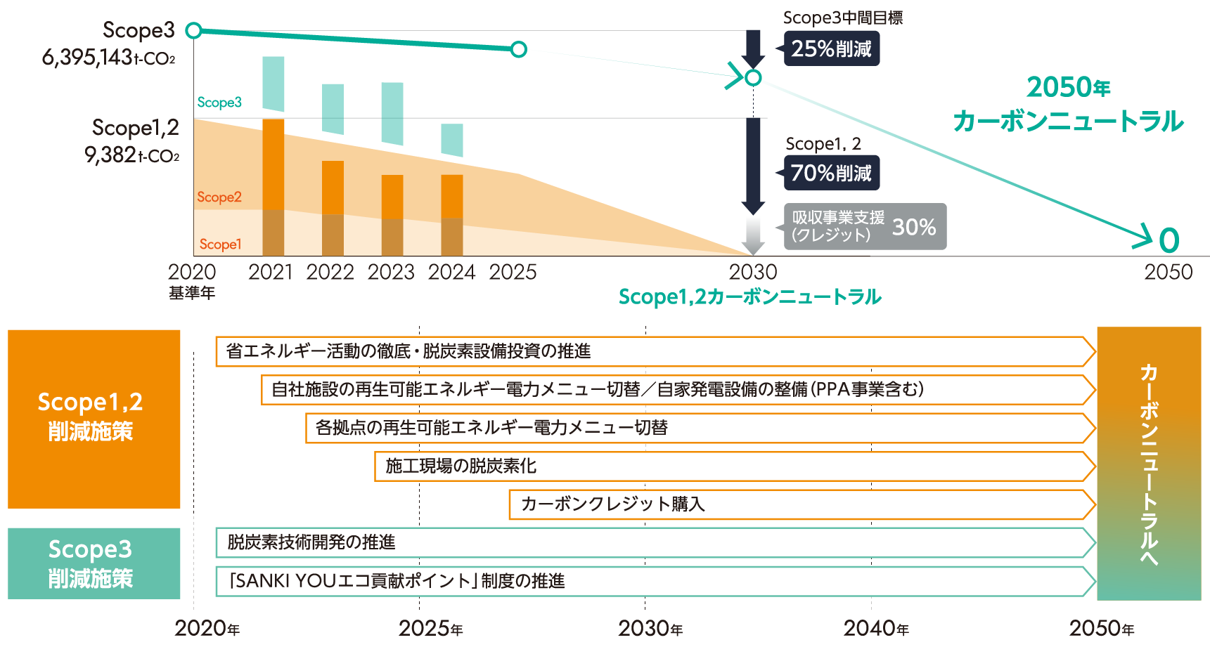当社グループは、「SANKIカーボンニュートラル宣言」においてScope1,2は2030年、Scope1,2,3は2050年のカーボンニュートラル達成を掲げています 具体的には、2030年までにScope1,2の排出量を70%削減(2020年度比)し、残りの30%は吸収事業支援(クレジット活用)によって削減することで、Scope1,2のカーボンニュートラル実現を目指しています。さらに、Scope3については2030年までに25%削減(2020年度比)を目標として掲げています。