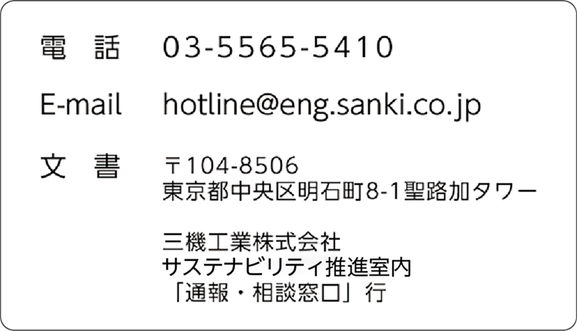独占禁止法違反行為の通報窓口「公正取引ホットライン」、コンプライアンス関連通報相談窓口「企業倫理ホットライン」、女性向け通報相談窓口「女性ほっとライン」、「ハラスメント等悩み相談室」を設置しています。加えて、「もっと気軽に相談できる女性の窓口がほしい」という従業員の意見を取り入れ、2024年度より当社グループ女性従業員が社外に相談可能な「SANKI女性あんしんダイヤル」の運用を開始しました。すべての窓口は、当社グループで働くすべての方(従業員以外も含む)が利用可能です。また、ホームページに協力会社向け「通報・相談窓口」を設置し、より風通しのよい関係の構築を目指しています。