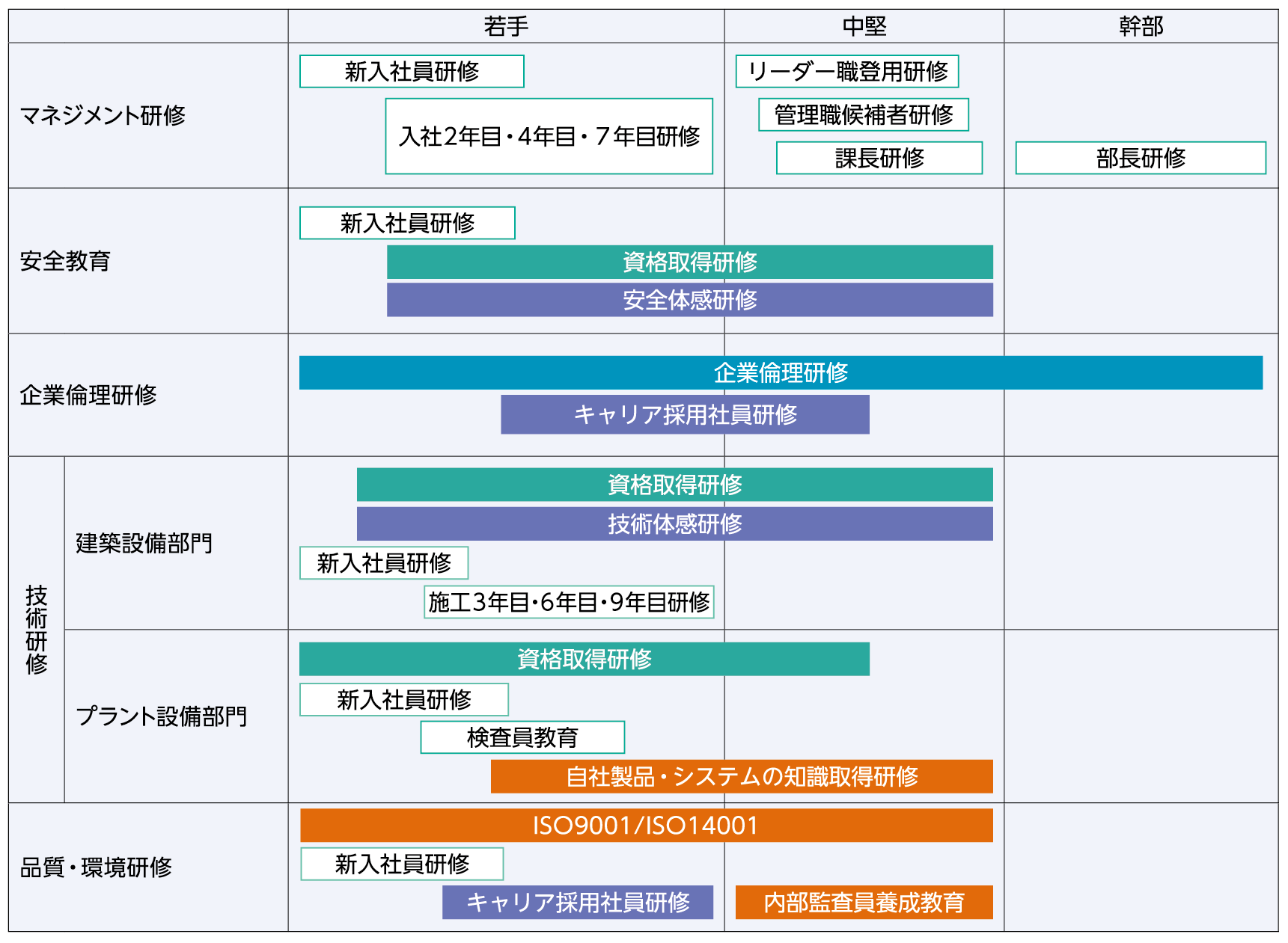 マネジメント研修、技術研修、分野別研修など、キャリアに応じた研修、管理職のリーダーシップ醸成研修を整備しています。各種研修の実施には、三機テクノセンターを積極的に活用しています。