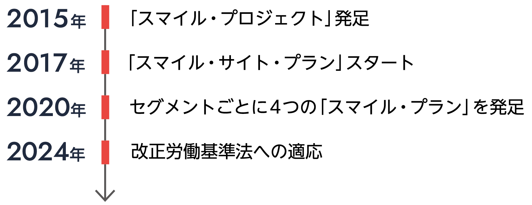 当社は、かねてより革新的な働き方改革を推し進めています。建設業として初めての週休2日制の導入から始まり、2015年度に社長をリーダーとする全社横断的な「スマイル・プロジェクト」を開始し、より働きやすい環境づくりに全社的に取り組んできました。2017年度には施工現場に特化した委員会「スマイル・サイト・プラン」、2020年度には各セグメントで「スマイル・プラン」を発足し、全部門が一体となって取り組める体制を整備しました。また「スマイル・プロジェクト」を推進していくために、2019年度に職場環境と人財育成に関する基本的な考え方を示したスマイル・ワーク・ガイドラインを策定しました。